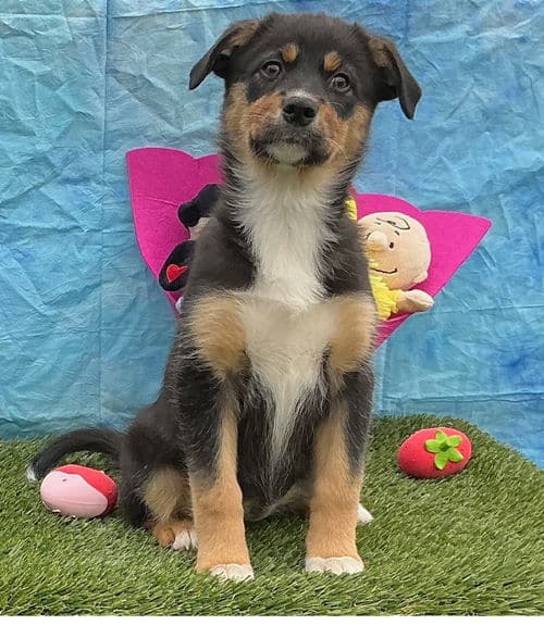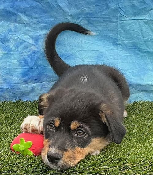Zayda is a three-month-old female Aussie/Rottie/maybe Heeler mix, surrendered to us when their other dog did not like her. She has that herding/nipping instinct like Heelers so perhaps best with children ten years or older as toddlers and their parents may not understand her nipping at their heels to herd them. Zayda should be in the 60-70 lb range when fully grown and her foster mom reports that “Zayda is very smart happy playful puppy.. absolutely loves the water! And quite the cuddle bug! Knows the doggy door!”