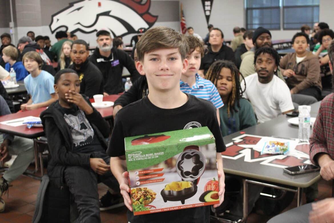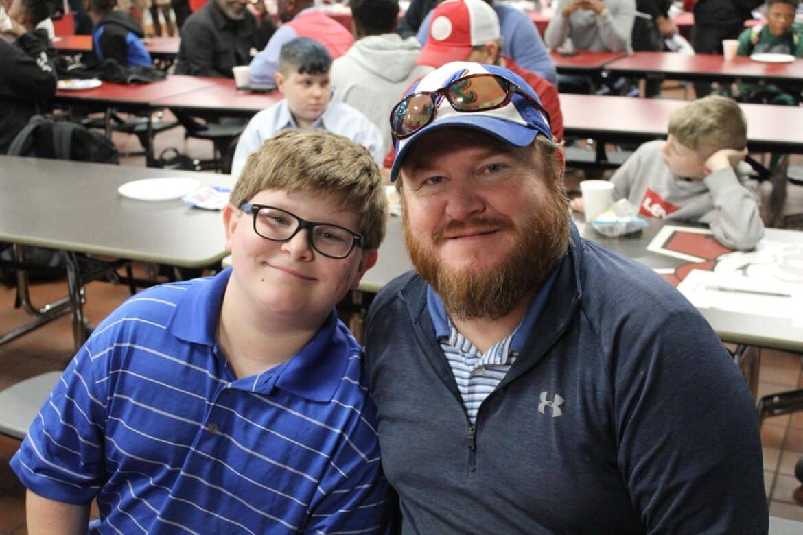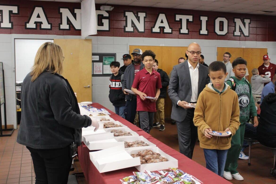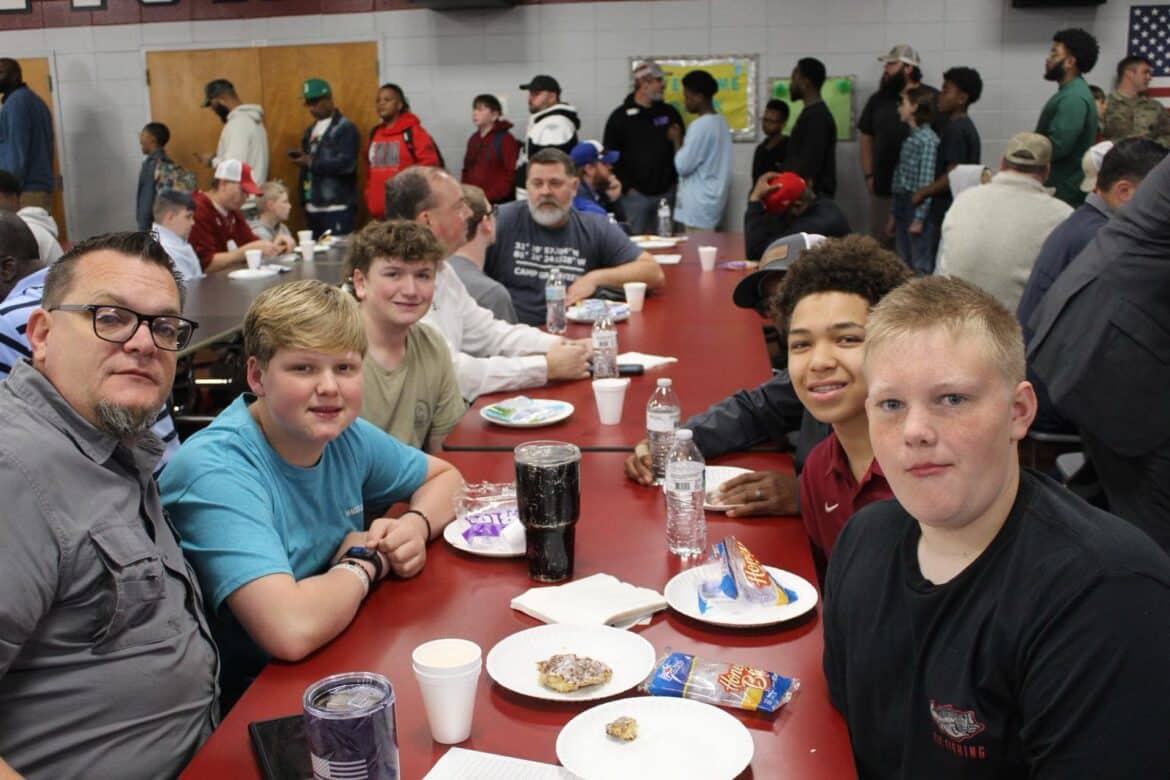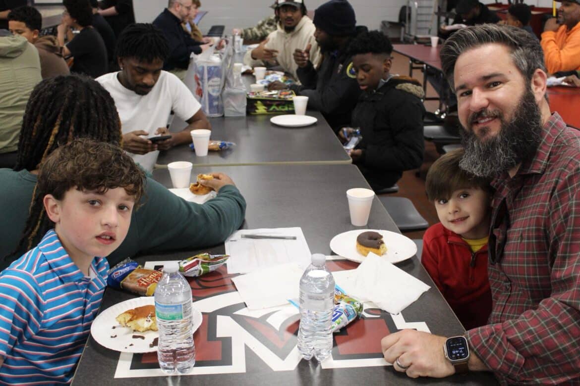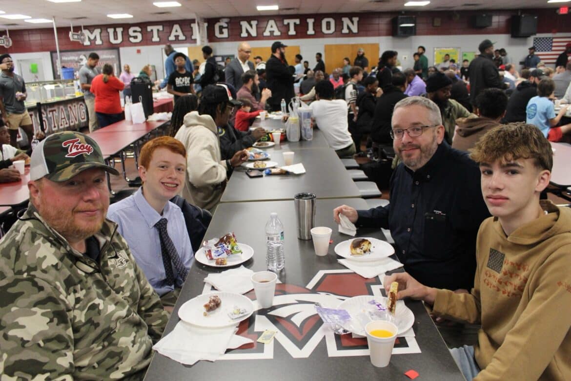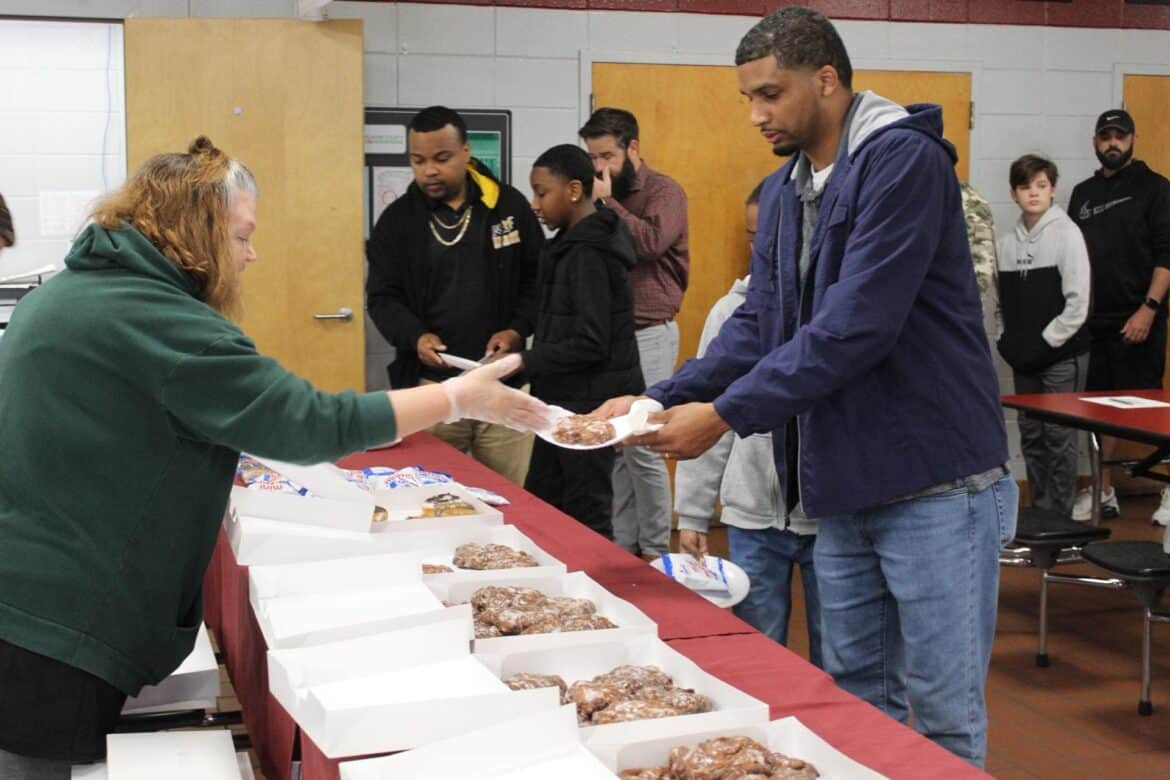 Last week, Millbrook Middle School hosted their annual Fritters and Father Figures event in the school cafeteria. Over 150 students attended with their fathers and father figures. This year, Coach Charlie Goodyear, an Assistant Athletic Director for Athletic Performance at Huntingdon College, was the guest speaker. Letitia Ruffin-Johnson, Assistant Principal for 5th and 6th grade, was in charge of putting this event together for the school. All guests enjoyed fritters, and donuts provided by Kingdom Dough of Millbrook. Coffee was provided by Sweet Hart Coffee Co., in Millbrook. Door prizes were given out at the end. Some of these amazing prizes were graciously donated by the Floyd family of Main Street Vintage Market, a swag bucket donated by Kyle Jenkins owner The Worx Auto Detail, a hat from the Millbrook Area Chamber of Commerce, and other wonderful prizes.