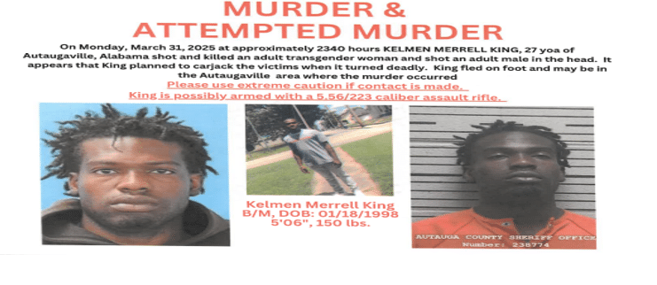 On Monday, March 31, 2025 at approximately 2340 hrs. Kelmen Merrell King, 27, of Autaugaville, Alabama allegedly shot and killed a transgender woman, then shot an adult male in the head. It appears that King attempted to carjack the victims when it turned deadly. The adult male was treated at Baptist Hospital and released. King fled on foot but Sheriff Harrell says he is now in custody.
