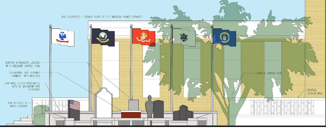 The plan would require moving the monuments but would showcase a larger area professionally done as a memorial plaza. Within the area will be the bricks with names of veterans, benches, six flag poles to represent all branches, walkways and a circle with the professional fire pit for flag disposal.