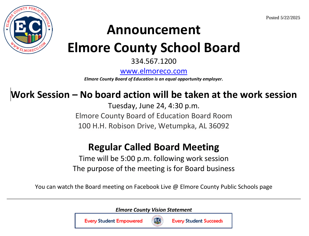 The work session will be held at 4:30 p.m. Thet Board meeting will begin afterwards at 5 p.m. You can watch the meeting live on their Elmore County Public Schools Facebook page.
