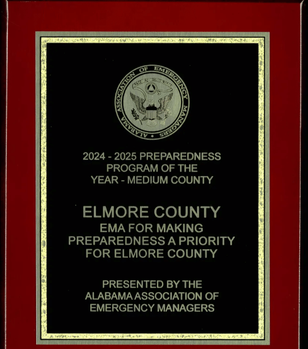 The Elmore County Emergency Management Agency (EMA) was recognized at the 2025 Alabama Association of Emergency Managers (AAEM) conference as the recipient of the 2024-2025 Preparedness Program of the Year Award for medium size counties. This award is given to a program that has developed a structure in preparing for disasters. The Elmore County EMA has developed a plan, exercised a plan, developed a volunteer management program, and worked alongside our citizens and the communities in our County to be prepared in the case of an emergency. Some of the programs the Elmore County EMA has implemented are: Be Ready Day, Storm Spotter, and Continuity Plans just to name a few. Our EMA also provides opportunities for our citizens to be prepared and to be able to assist others through Community Emergency Response Team (C.E.R.T.) courses which are held throughout the year.