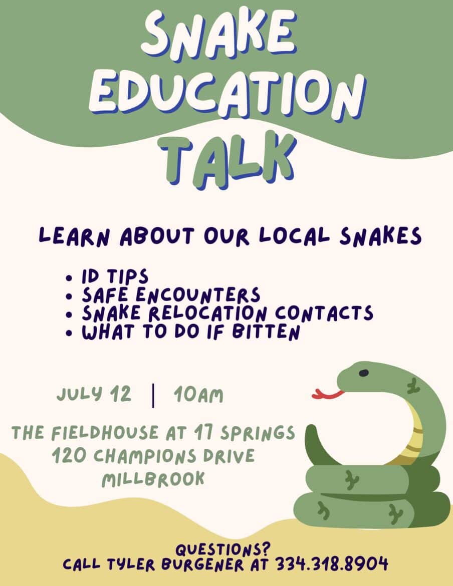 You are invited to come to the Field House at 17 Springs July 12 at 10 a.m. for a Snake education Talk.