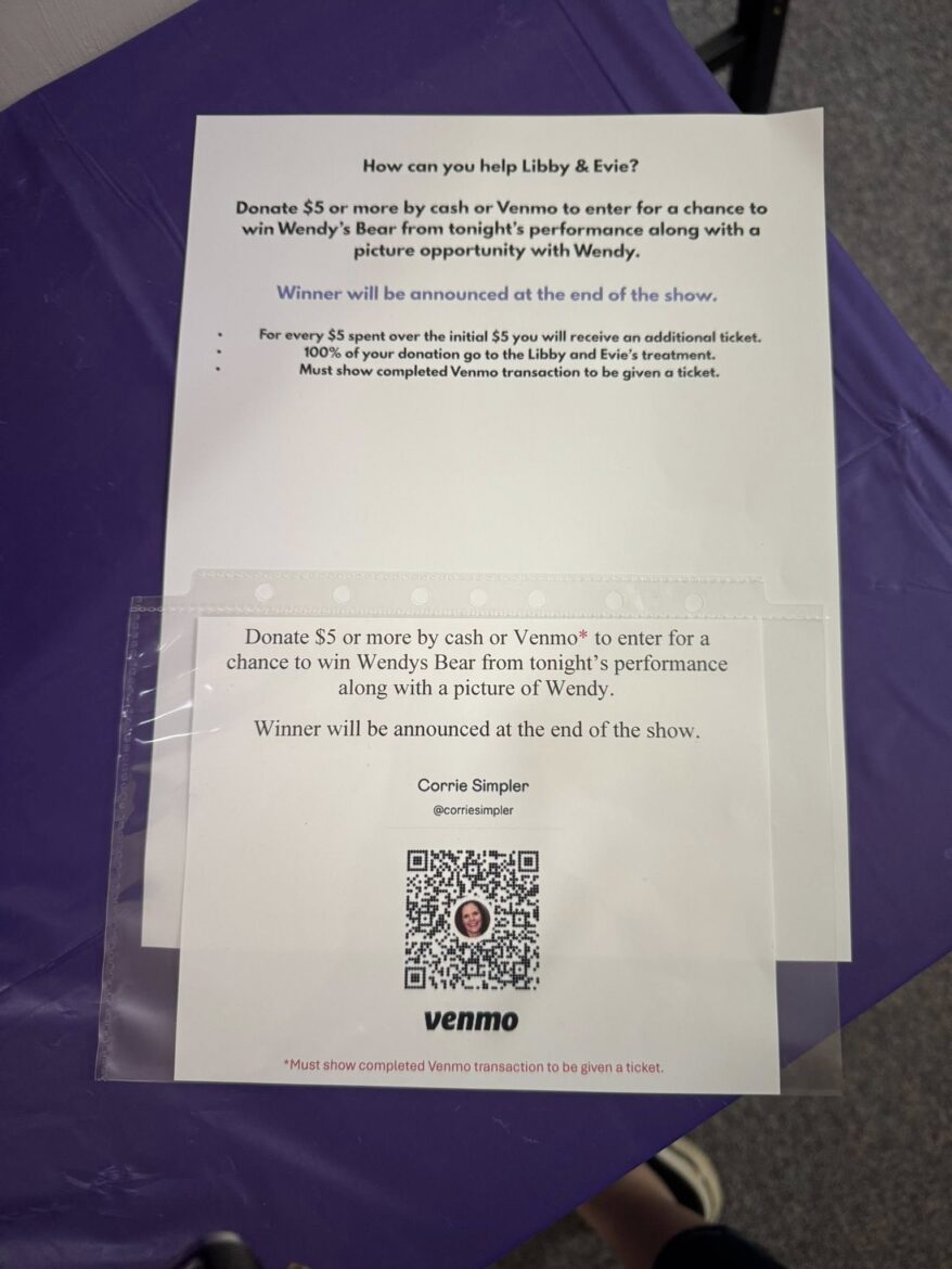 Donate $5 or more by cash or Venmo to enter for a chance to win Wendy’s Bear from tonight’s performance along with a picture opportunity with Wendy.