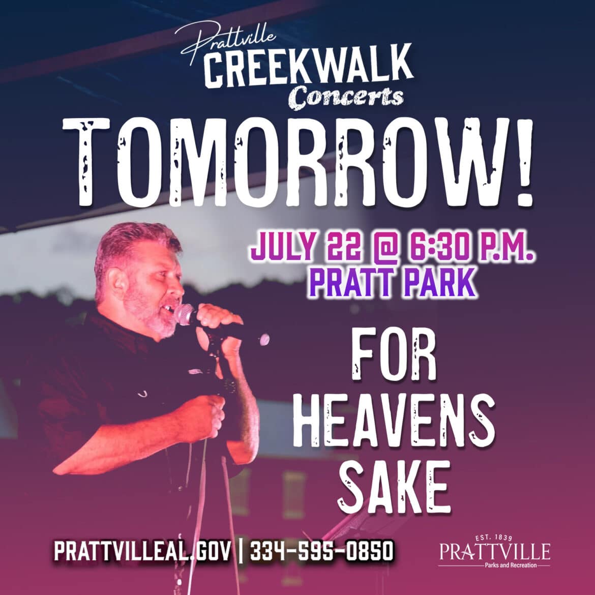 Come out Tuesday for one last summer celebration with the band For Heaven’s Sake, at 6:30 PM in Pratt Park! Bring your friends, family and a couple of lawn chairs!🌟🎤