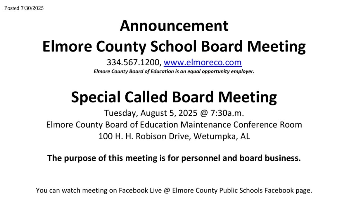 The Elmore County School Board has announced a special called board meeting for August 5, to discuss board and personnel business.