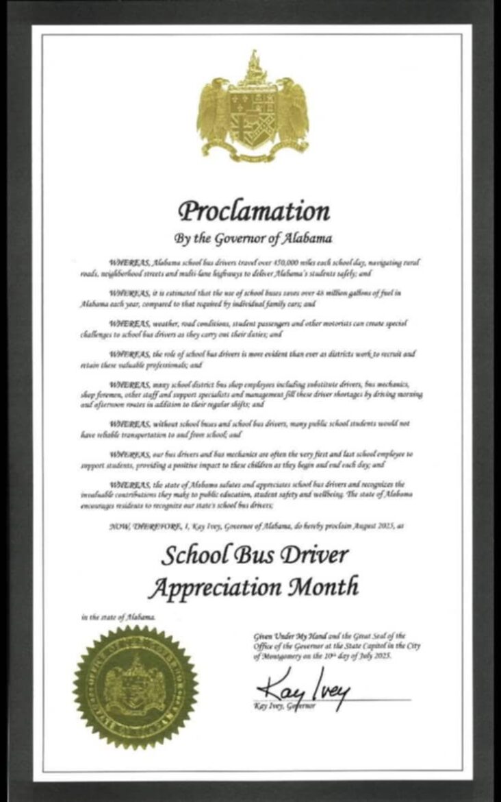 Governor Ivey said “the State of Alabama salutes and appreciates school bus drivers and recognizes the invaluable contributions they make to public education and student safety and well-being. The State of Alabama encourages residents to recognize the excellence of our state’s school bus drivers and their strong record of safety. Now therefore I, Kay Ivey, Governor of the State of Alabama, do hereby proclaim August 2025 as “School Bus Driver Appreciation Month” in Alabama, and commend its observance to all citizens.”