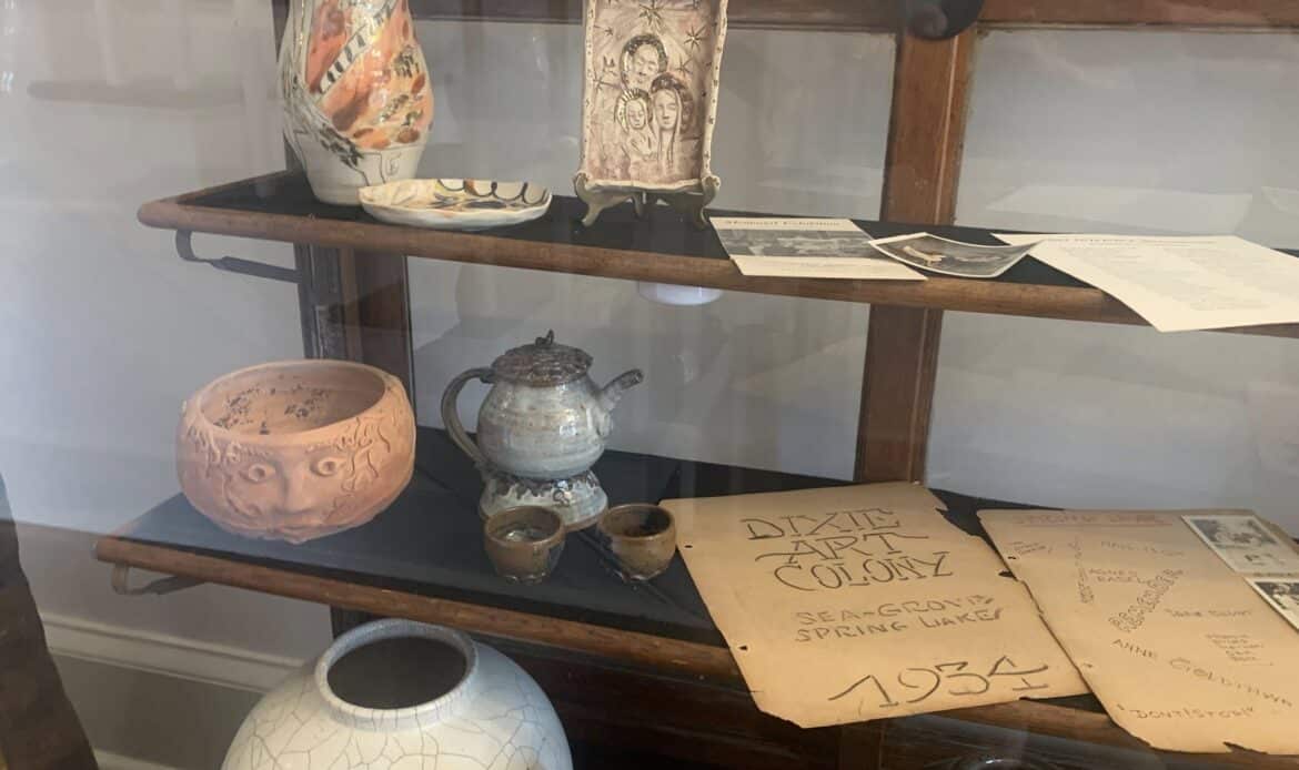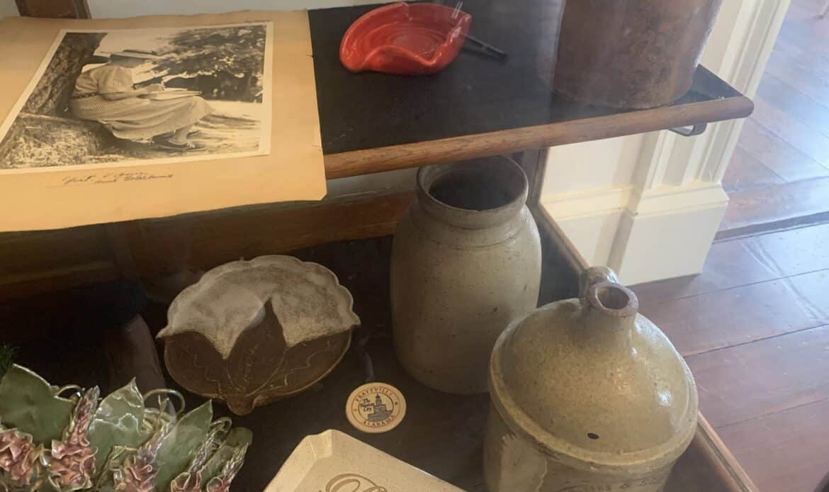 The DIXIE ART COLONY (DAC) Foundation partnered with ACHA on this exhibit. DAC artists, located in central Alabama, traveled the area painting local sites. Several original examples by DAC artists are found in the exhibit. A watercolor and pencil sketch of Boggโs Pottery by noted Southern artist, Kelly Fitzpatrick, are featured in the display. The interest in the potteries followed the discovery of exceptional clay in Autauga County in the early 1900s attracting potters who came to the Prattville area to create utilitarian pottery for everyday use. Today new homes cover the site of an early pottery, Chalk Hill Pottery, located on Old Ridge Road. Other potteries, Tatumโs, Watsonโs preceded the well-known Boggโs Pottery. Later in the 1940s, a Mr. Spencer came to Prattville and opened a pottery on Highway 31. He was a chemist who was employed by the Prattville Cotton Mill and later served as mayor of the newly incorporated town, Prattmont! A decorated jug made by Spencer is on display. Current artists, Julianne Hansen and Jane Boutwell also contributed pottery works they created.