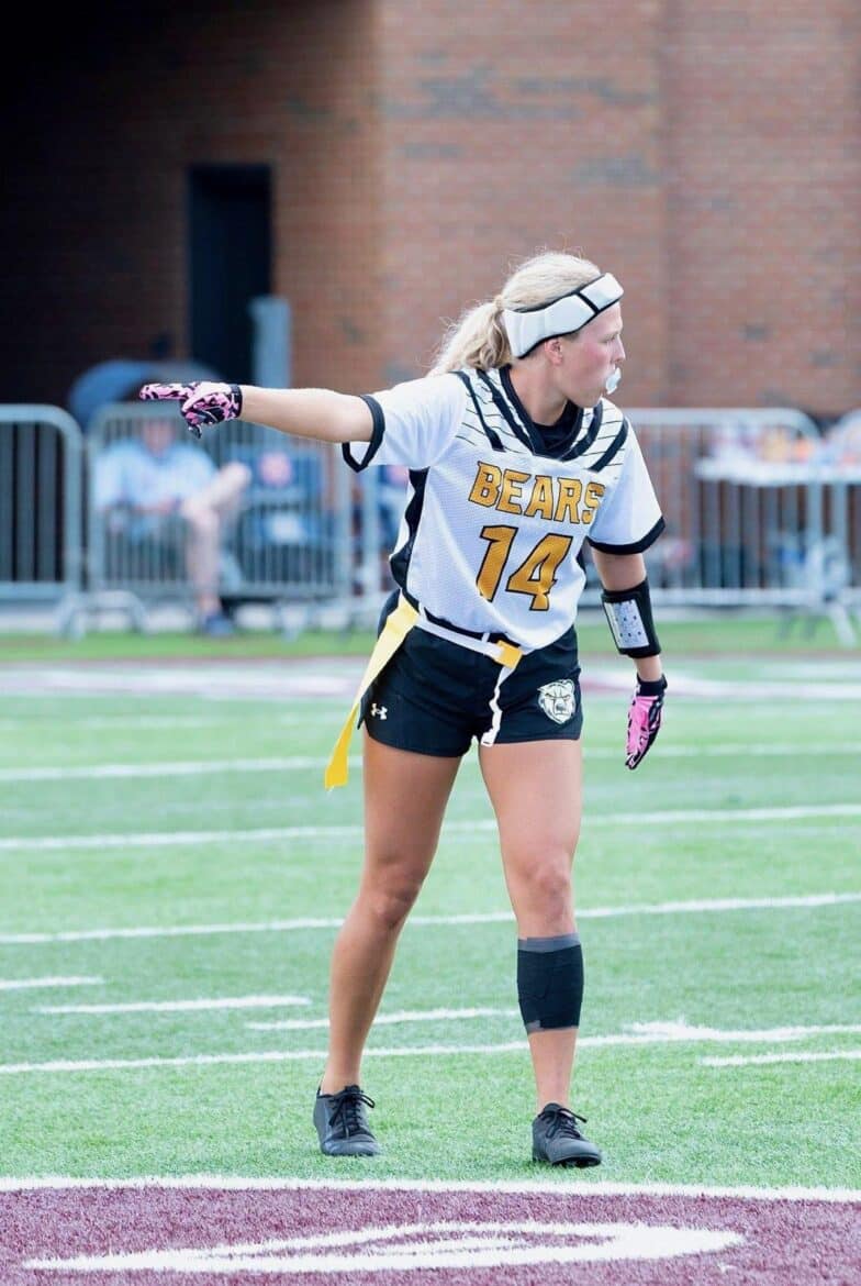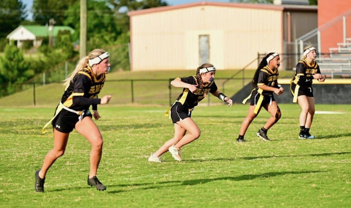 The process of starting a flag football program at Billingsley started when 21 girls tried out for the team, but two players decided not to play prior to the season. “When it came to positions, we let all the girls try any position they wanted and we evaluated them on their skills. When it got closer to summer practice time you could tell who separated themselves at certain positions. Starting a program has been a very fun process. Our AD Lanny Jones knew it takes money and being new there was no money in an account for flag football, so he said football would help us in year one getting what we need. Plus the support of our administration made game one special with a champions walk for the first game. But that support also comes from other coaches that share athletes. Seeing the town of Billingsley at our game made me feel like this is the right school for this sport.”