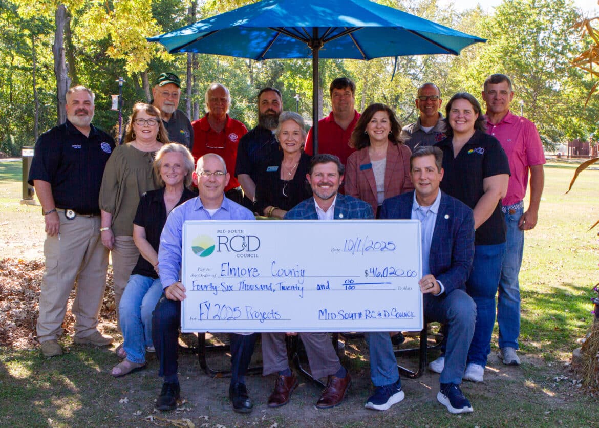 Elmore County leaders, community members, and partners celebrated the impact of a $46,020 grant from Mid-South Resource Conservation and Development (RC&D) with a check presentation, Oct. 1, 2025, at Village Green Park.