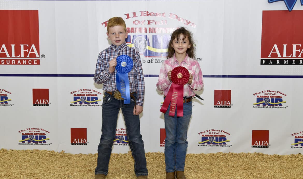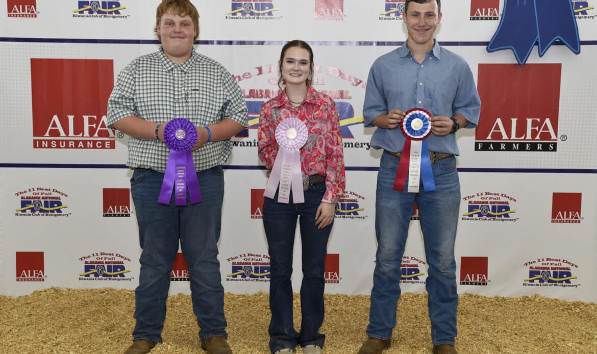 Beginner Premier Exhibitor winners in the Youth Goat Show at the Alabama National Fair Oct. 4 in Montgomery were, from left, Mikayla Horne of Autauga County, first place; and Boone Maples of Chambers County, second place. The Premier Exhibitor competition tests students’ livestock knowledge, evaluation skills and showmanship ability. The beginner division is for students 4-8 years of age. Alabama Farmers Federation and Alfa Insurance sponsored youth livestock activities at the fair.Beginner Showmanship winners in the Youth Goat Show at the Alabama National Fair Oct. 4 in Montgomery were, from left, Boone Maples of Chambers County, first place; and Mikayla Horne of Autauga County, second place. The beginner division is for students 4-8 years of age. Alabama Farmers Federation and Alfa Insurance sponsored youth livestock activities at the fair.Senior Premier Exhibitor winners in the Youth Goat Show at the Alabama National Fair Oct. 4 in Montgomery were, from left, Nathan Brand of Tuscaloosa County, first place; Ella Alldredge of Blount County, second place; and Caleb Hornady of Autauga County, third place. The Premier Exhibitor competition tests students’ livestock knowledge, evaluation skills and showmanship ability. The senior division is for students 16-19 years of age. Alabama Farmers Federation and Alfa Insurance sponsored youth livestock activities at the fair.Senior Showmanship winners in the Youth Goat Show at the Alabama National Fair Oct. 4 in Montgomery were, from left, Ella Alldredge of Blount County, first place; Nathan Brand of Tuscaloosa County, second place; and Caleb Hornady of Autauga County, third place. The senior division is for students 16-19 years of age. Alabama Farmers Federation and Alfa Insurance sponsored youth livestock activities at the fair.