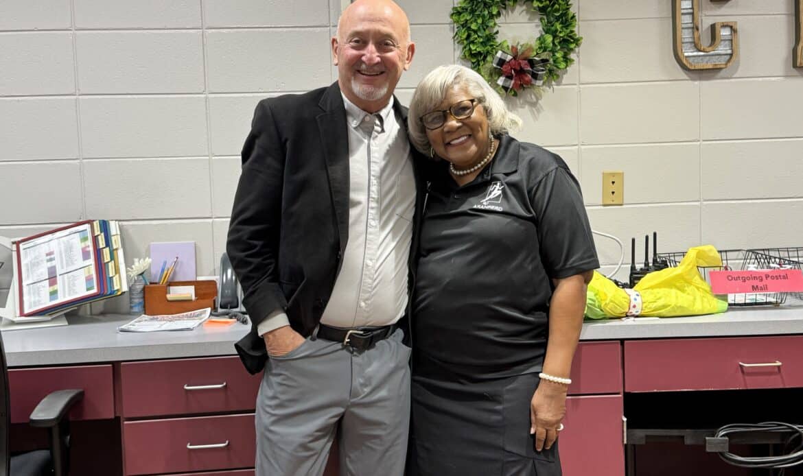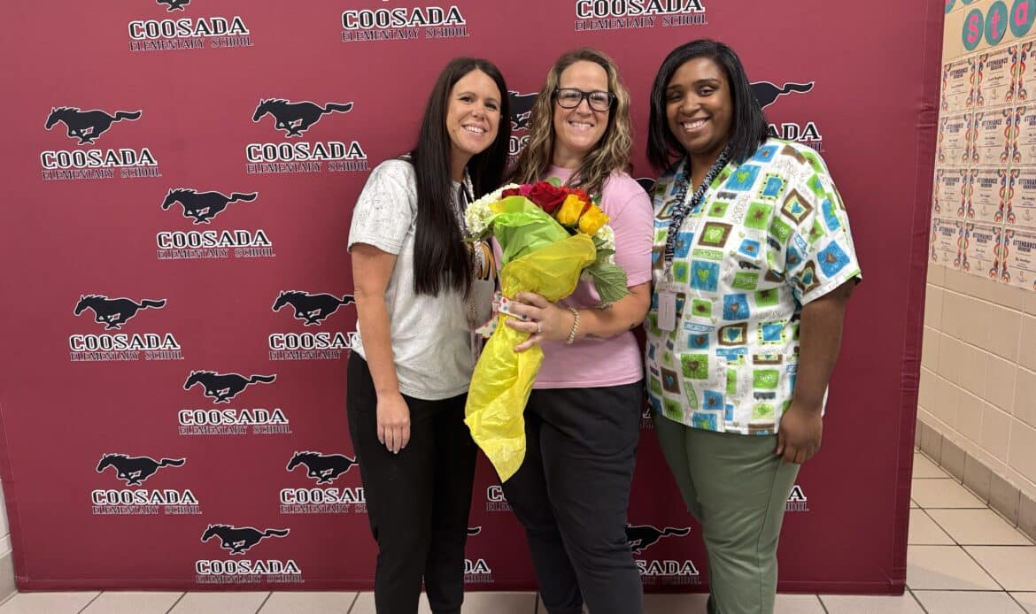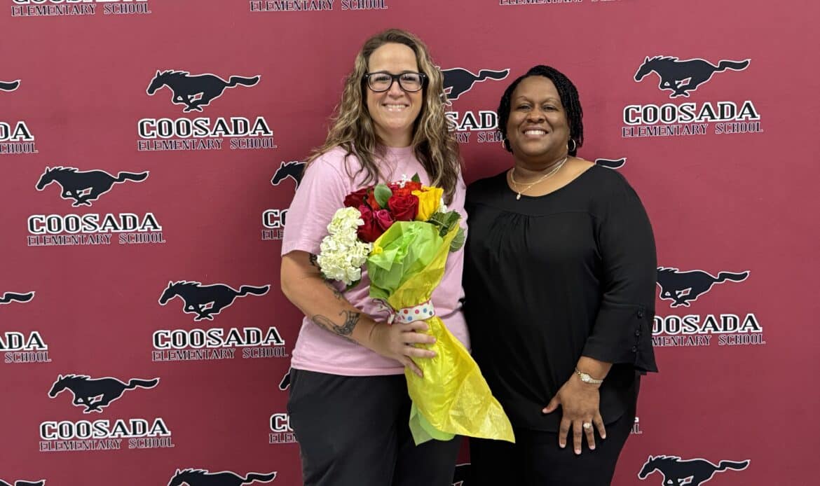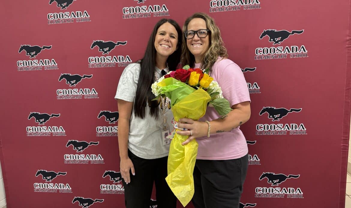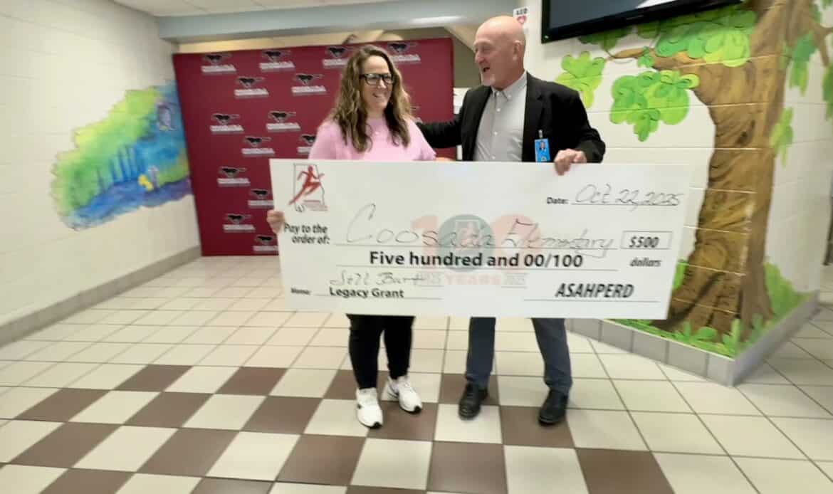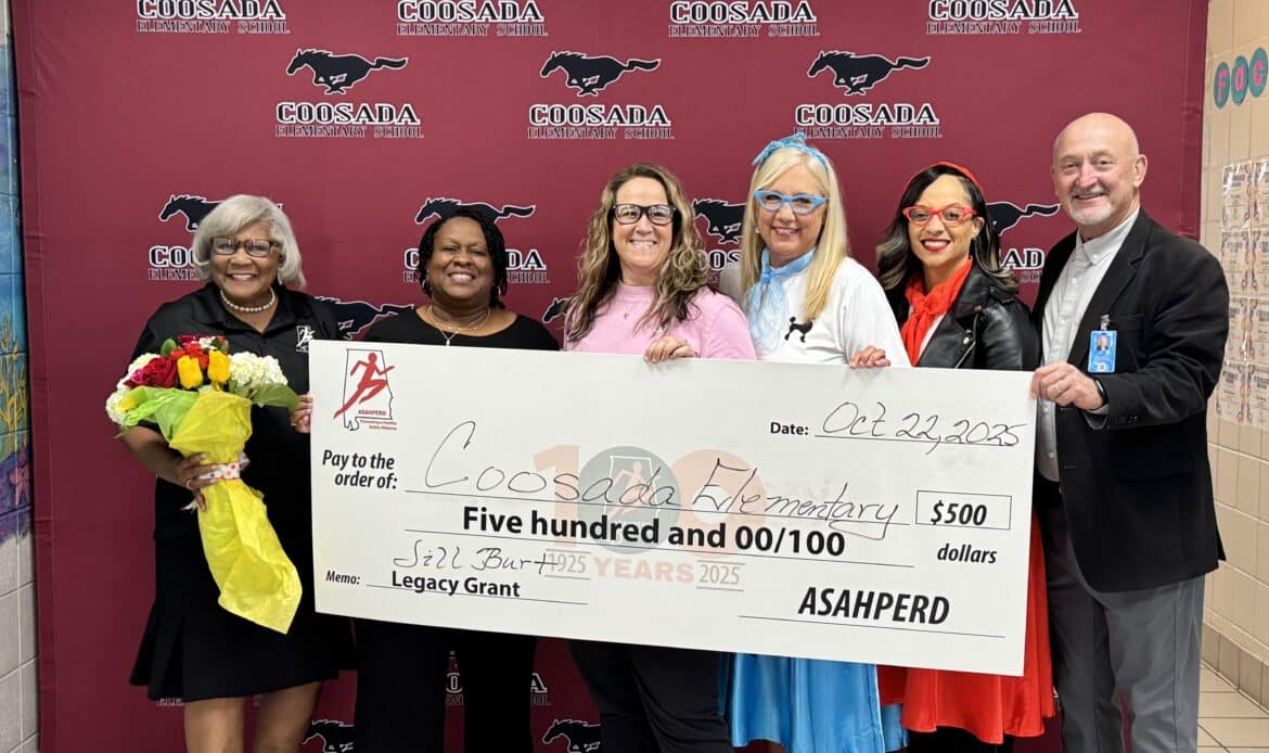 Connie Dacus with the Alabama State Association for Health, Physical Education, Recreation and Dance (ASAHPERD) surprised Jill Burt, the adaptive physical education (PE) teacher for Coosada Elementary School, Oct. 22, 2025, with a check for $500.
