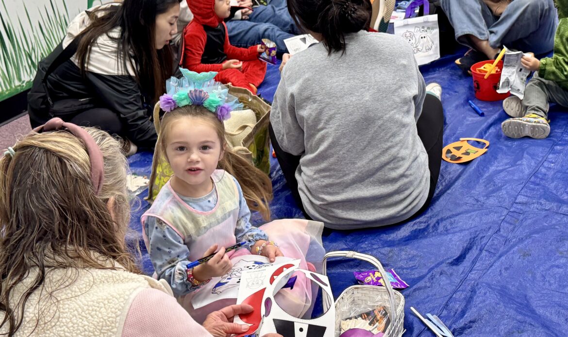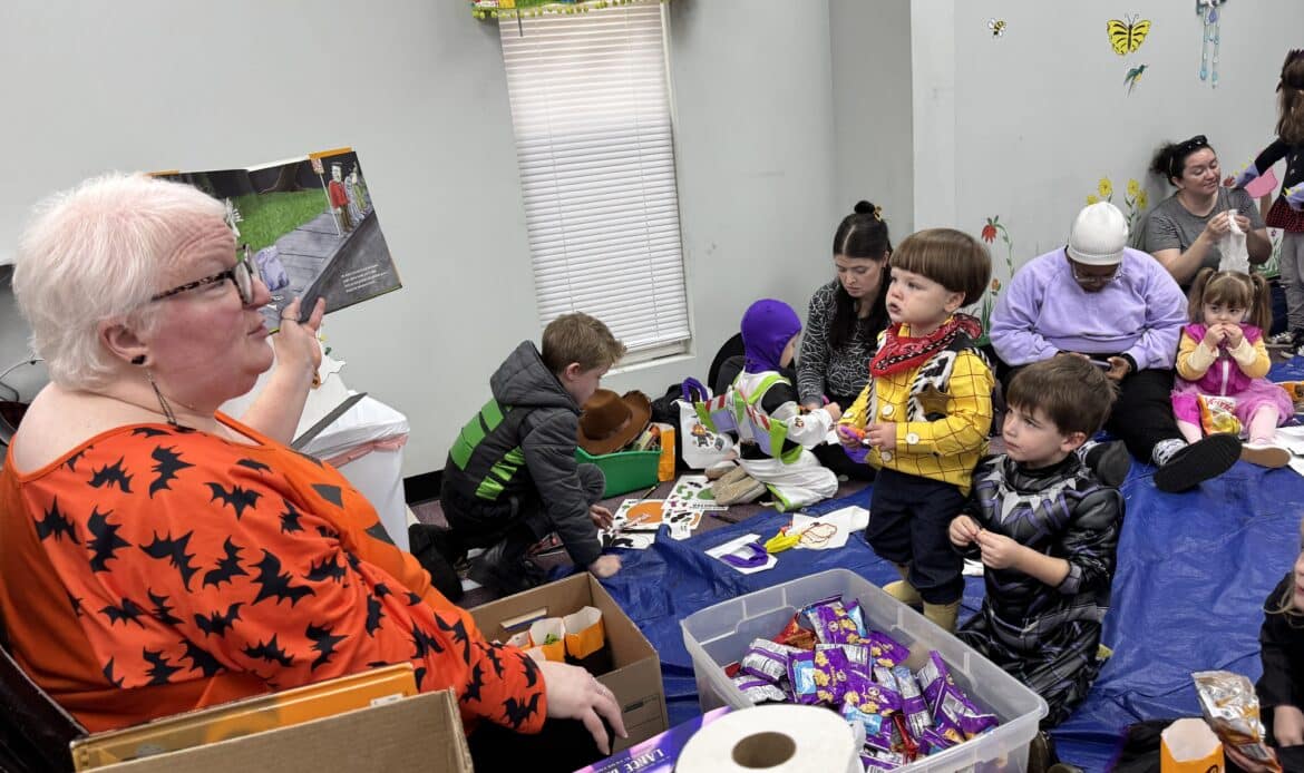 The children’s librarian, Angela Dewberry, read four Halloween books to the children during the story hour. The families enjoyed coloring trick-or-treat bags, coloring sheets, and cutouts to take home. Dewberry also read a popular book that the children love listening to each week in October, called 𝐼𝑛 𝑡ℎ𝑒 𝐷𝑎𝑟𝑘, 𝐷𝑎𝑟𝑘 𝑊𝑜𝑜𝑑 by David A. Carter.