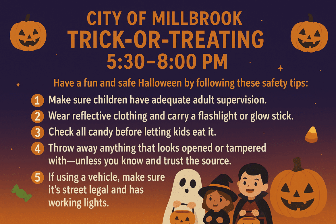 Halloween festivities will be observed Friday night, Oct. 31, 2025, in the City of Millbrook. The Millbrook Police Department will have extra personnel on duty, patrolling neighborhoods to ensure the safety of our citizens participating in the time-honored tradition of trick or treating. For those participating, we request that trick or treating activities begin between 5:30 and 6:00 PM, concluding no later than 8:00 PM. Keeping in mind that some people are having to work the following day. For the safety of all concerned, we offer the following safety tips/suggestions: