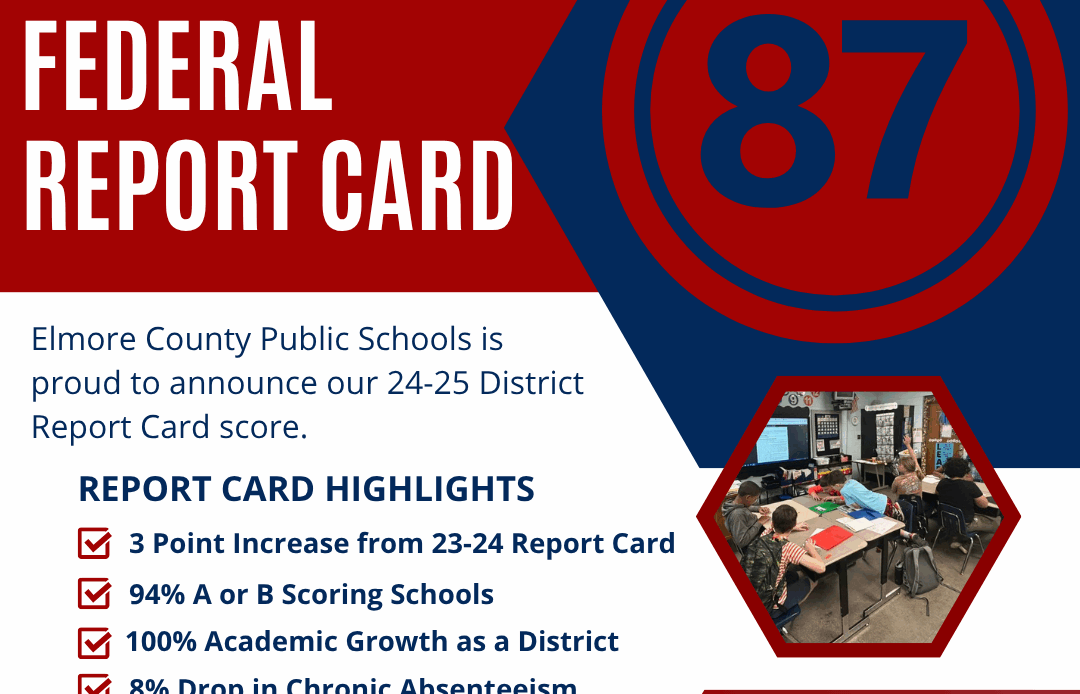 The 2024โ2025 state report cards are out, and Autauga County Schools (ACS) and Elmore County Public Schools have big reasons to celebrate! Both districts earned an impressive overall score of 87, their highest since the COVID-19 pandemic and the second highest since the state launched its current accountability system. This yearโs results highlight strong, steady momentum across campuses, with scores climbing three points over last year.