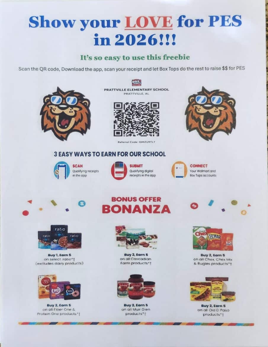 Getting involved is simple and something everyone can do. Traditionally, participants have collected box tops from boxes that participated in the Box Top program. Now, box tops are being received digitally by going on the Box Tops app and submitting receipts. Families can scan the QR code on the flyer, which takes you to the Box Tops app, where you create an account, Prattville Elementary School is already selected, and then you can scan receipts that include Box Tops-eligible products. Every qualifying purchase adds up, and you can watch the school’s total grow in real time right in the app.