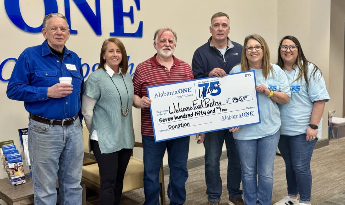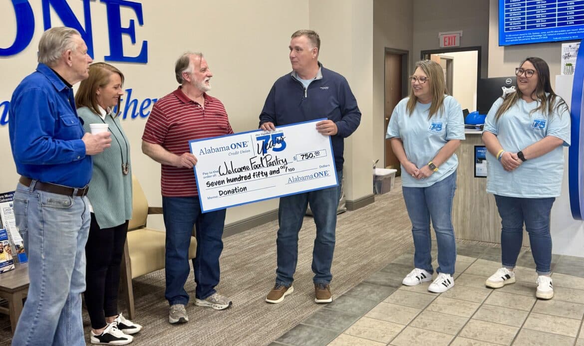 Alabama One Credit Union celebrates 75 years this year. In doing so, the company decided that they wanted to give back with a nod to 75 years by giving back to the local community and donating back to a local nonprofit. They confidently chose to give back to Millbrook’s local food pantry, The Welcome Food Pantry. Alabama One chose to stick with the theme of celebrating 75 years of business by donating $750 dollars to the local Welcome Food Pantry in Millbrook and a promise to be a part of serving and volunteering this year.