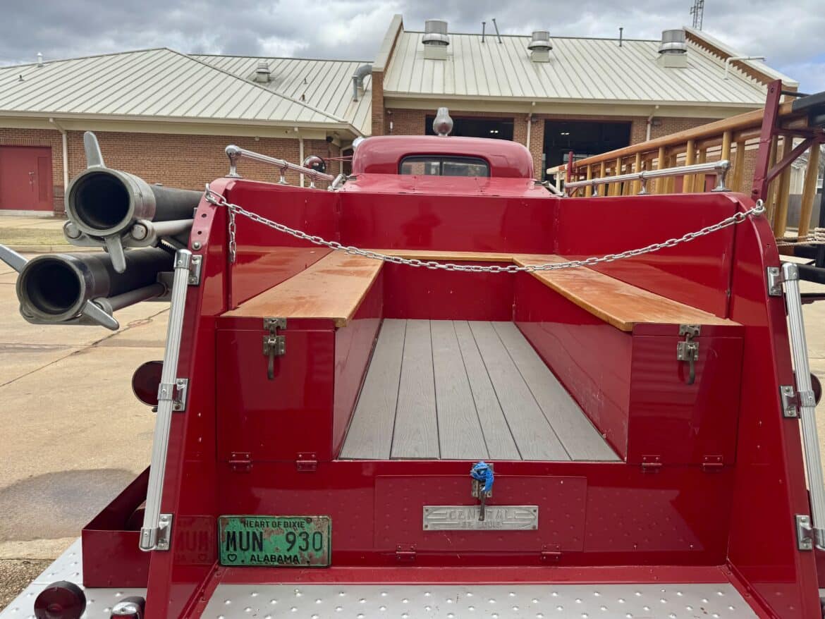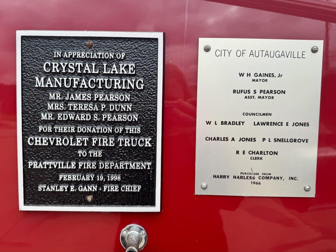 Built by Crystal Lake Manufacturing, the truck’s history is documented by plaques mounted along its sides. According to the plaques, it originated with the City of Autaugaville, which purchased the truck from Harry Harless Company, Inc. in 1966 before donating it to the Prattville Fire Department in 1998. Oakes explained, however, that some of the truck’s history may have been misinterpreted.