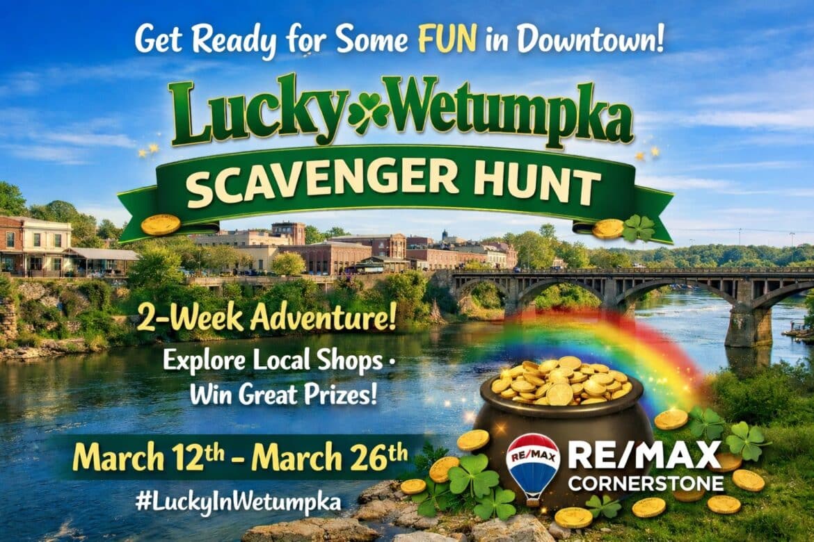 A two-week scavenger hunt in downtown Wetumpka aims to bring residents and visitors into local shops while offering chances to win prizes. The Lucky in Wetumpka Scavenger Hunt, presented by RE/MAX Cornerstone, runs from March 12 through March 26 in downtown Wetumpka.